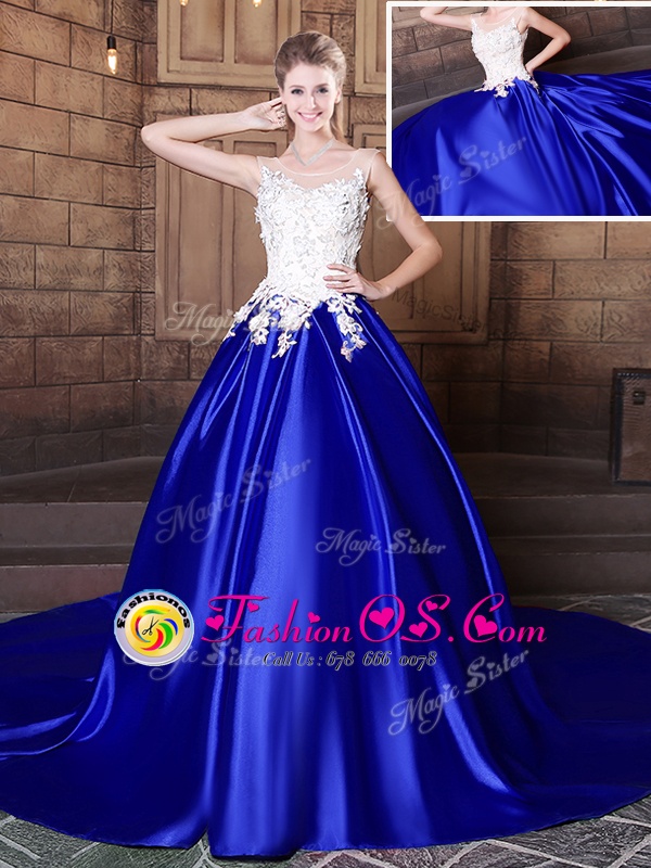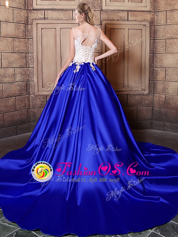Exquisite Scoop Royal Blue Ball Gowns Appliques Quinceanera Gown Lace Up Elastic Woven Satin Sleeveless With Train