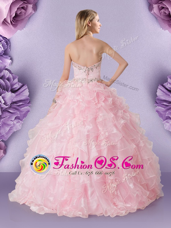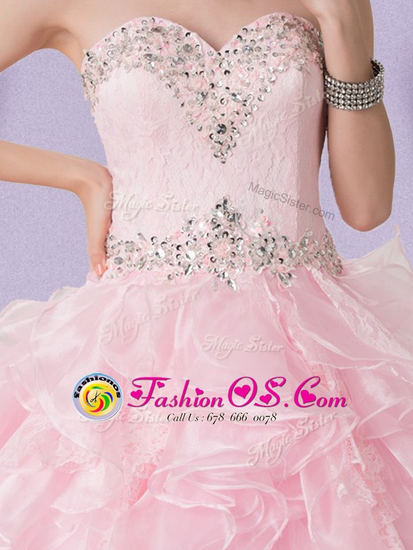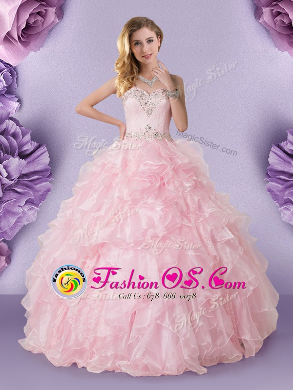 Glamorous Sleeveless Floor Length Beading and Ruffles Lace Up 15 Quinceanera Dress with Baby Pink