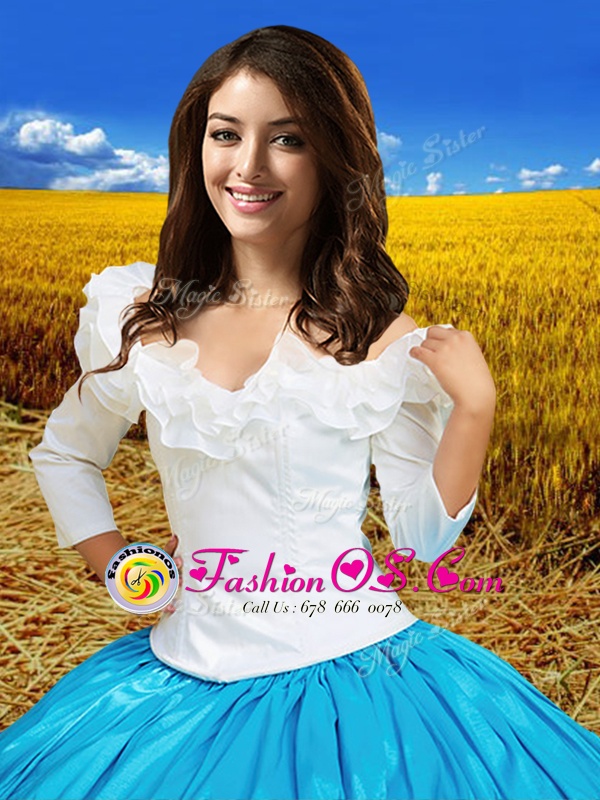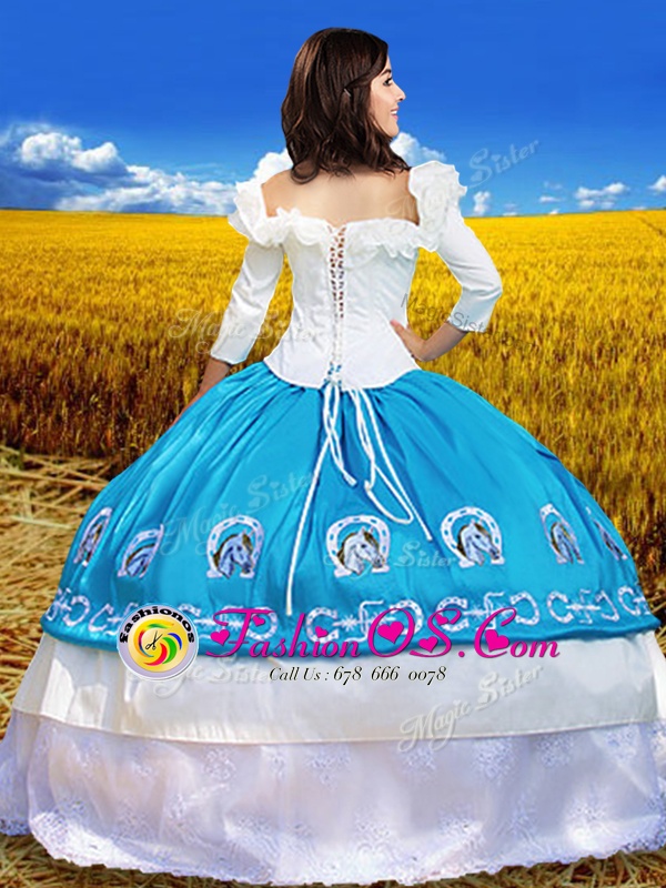 Blue And White Off The Shoulder Lace Up Lace and Embroidery 15 Quinceanera Dress 3|4 Length Sleeve