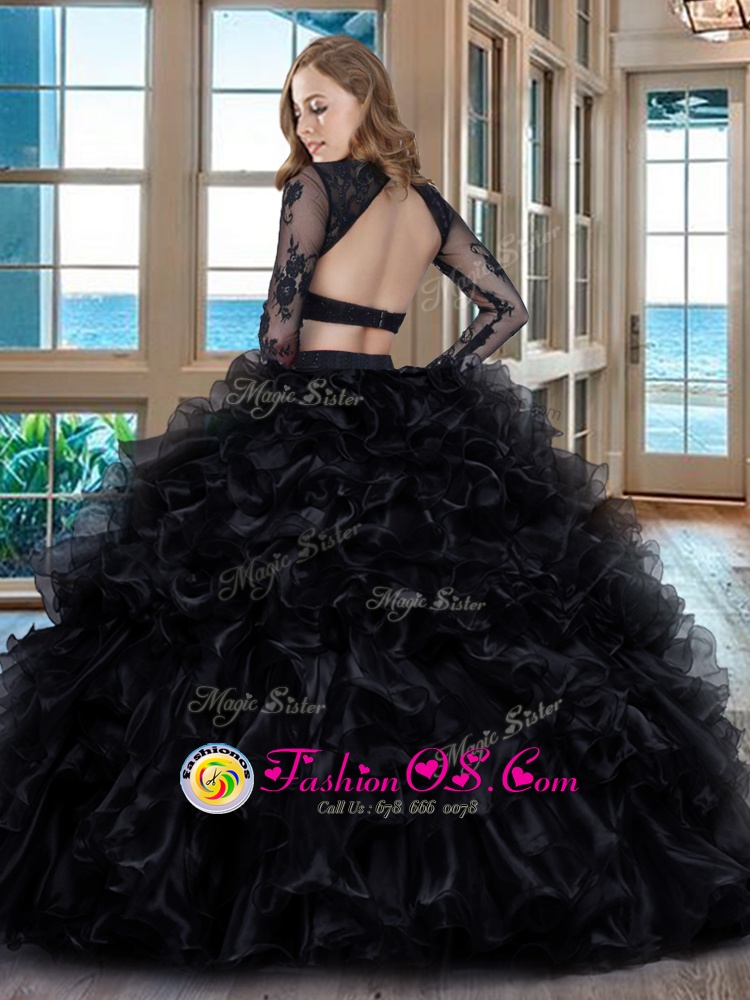 Scoop Backless Organza Long Sleeves Floor Length Ball Gown Prom Dress and Ruffles