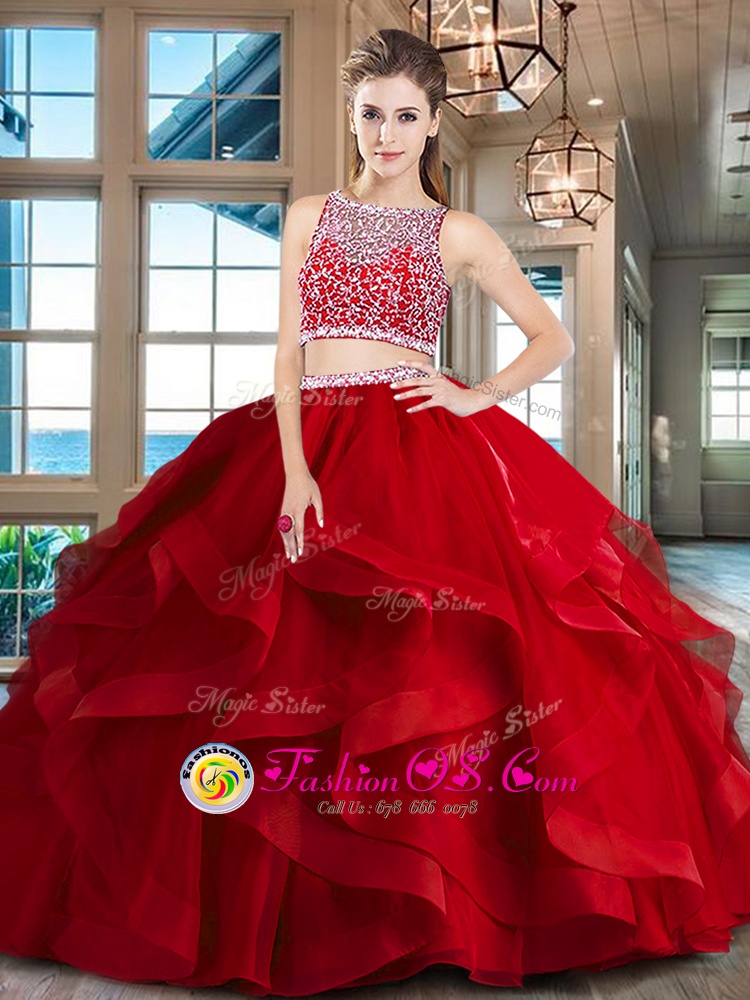 Sexy Red Bateau Neckline Beading and Ruffles Quinceanera Gowns Sleeveless Side Zipper