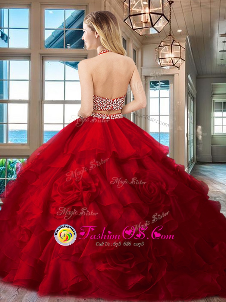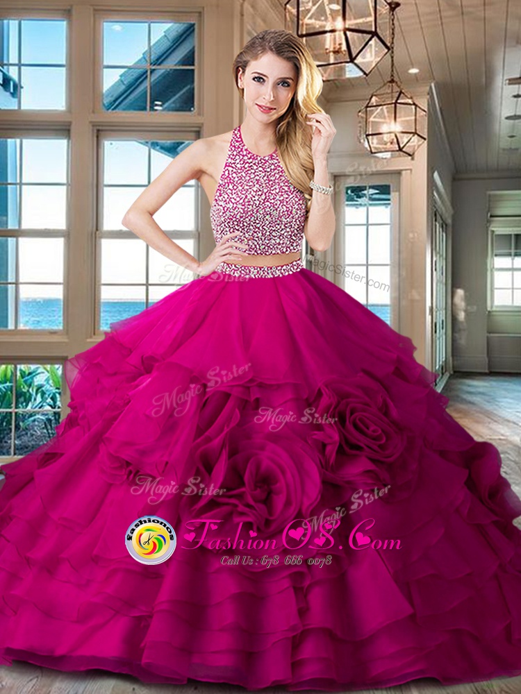 Halter Top Sleeveless Organza With Brush Train Backless Sweet 16 Quinceanera Dress in Fuchsia for with Beading and Ruffles