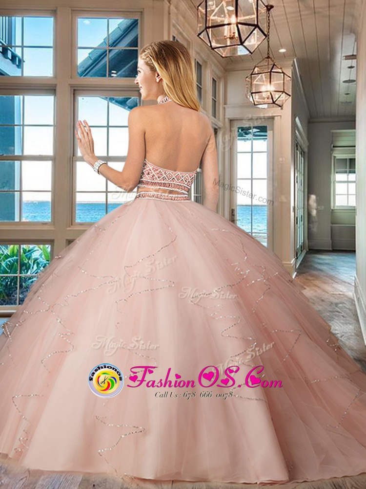 Exceptional Halter Top Backless Tulle Sleeveless Floor Length Sweet 16 Dress and Beading and Ruffles