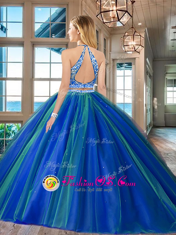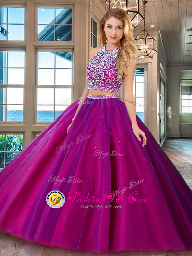 Scoop Fuchsia Tulle Backless Quinceanera Gowns Sleeveless Floor Length Beading