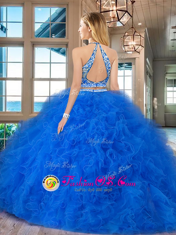 Red Backless Scoop Beading and Ruffles Quinceanera Gown Tulle Sleeveless