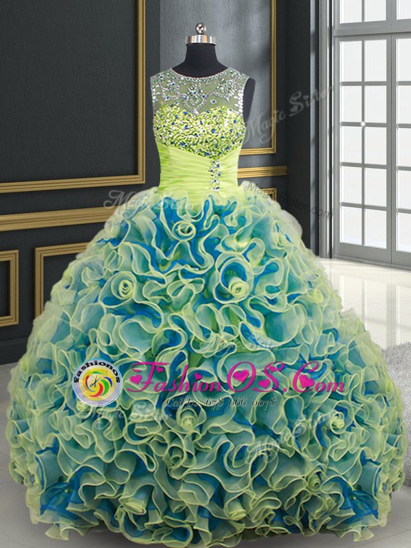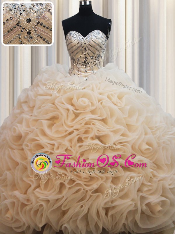 Stylish Champagne Lace Up Sweetheart Beading 15 Quinceanera Dress Fabric With Rolling Flowers Sleeveless Brush Train