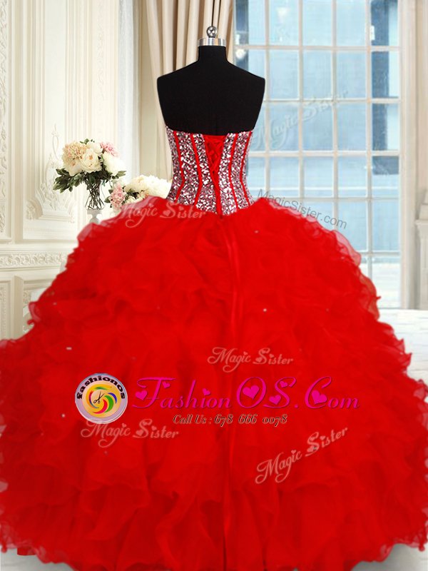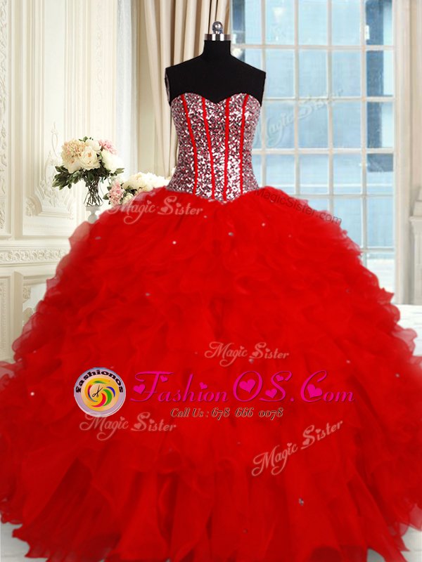 Red Ball Gowns Sweetheart Sleeveless Tulle Floor Length Lace Up Ruffles and Sequins 15th Birthday Dress