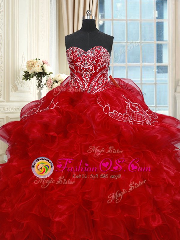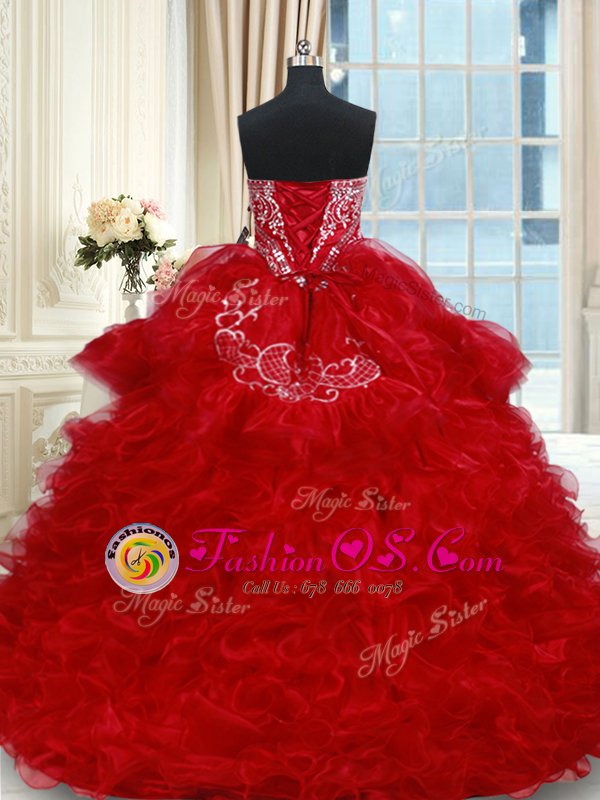 High End Red Ball Gowns Beading and Ruffles 15 Quinceanera Dress Lace Up Organza Sleeveless Floor Length