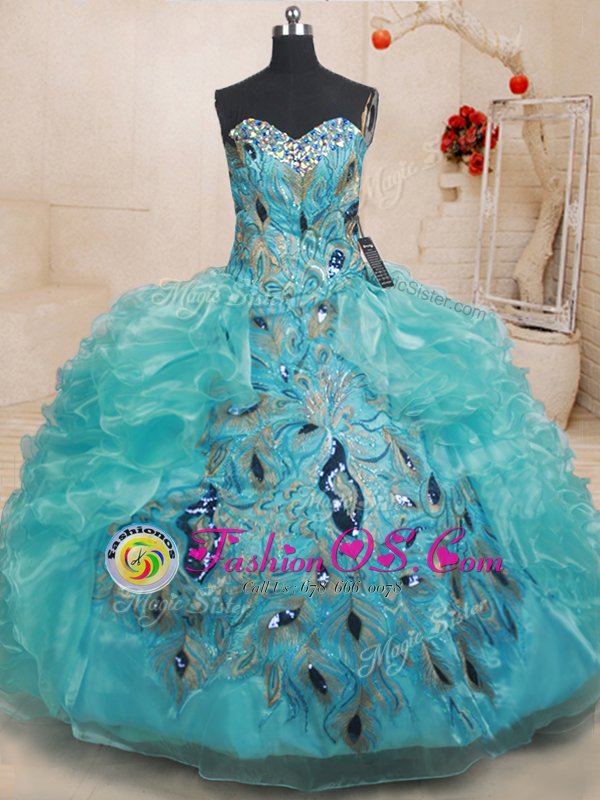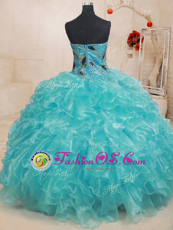 Dramatic Teal Ball Gowns Beading and Embroidery and Ruffles Quinceanera Gowns Zipper Organza Sleeveless Floor Length