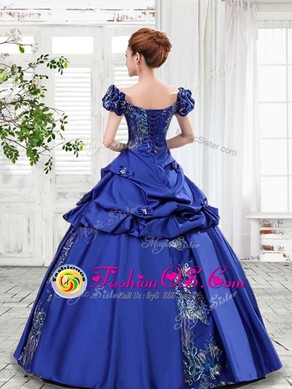 New Style Off the Shoulder Cap Sleeves Lace Up Floor Length Appliques and Pick Ups and Bowknot 15 Quinceanera Dress