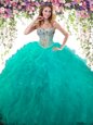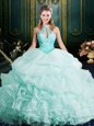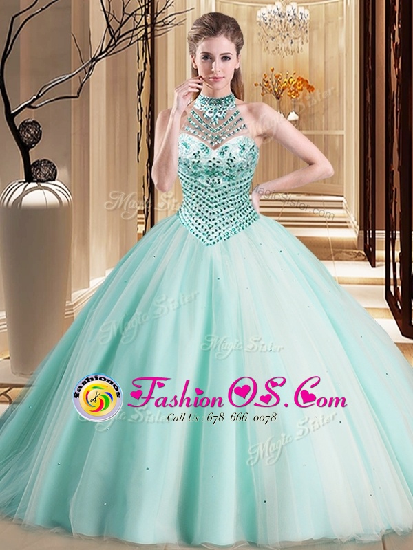 Halter Top Aqua Blue Lace Up Quinceanera Gowns Beading Sleeveless With Brush Train