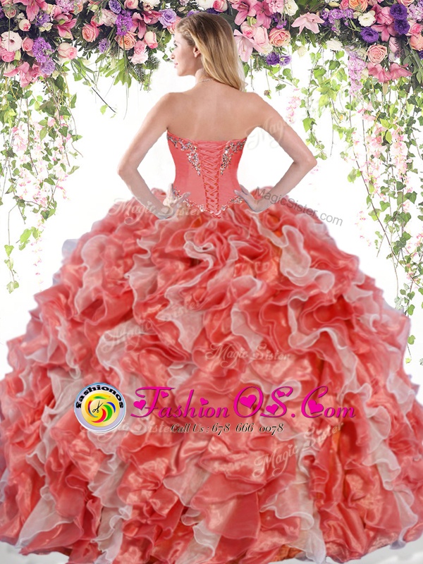 Romantic Organza Sweetheart Sleeveless Lace Up Beading and Ruffles Quinceanera Gown in White And Purple
