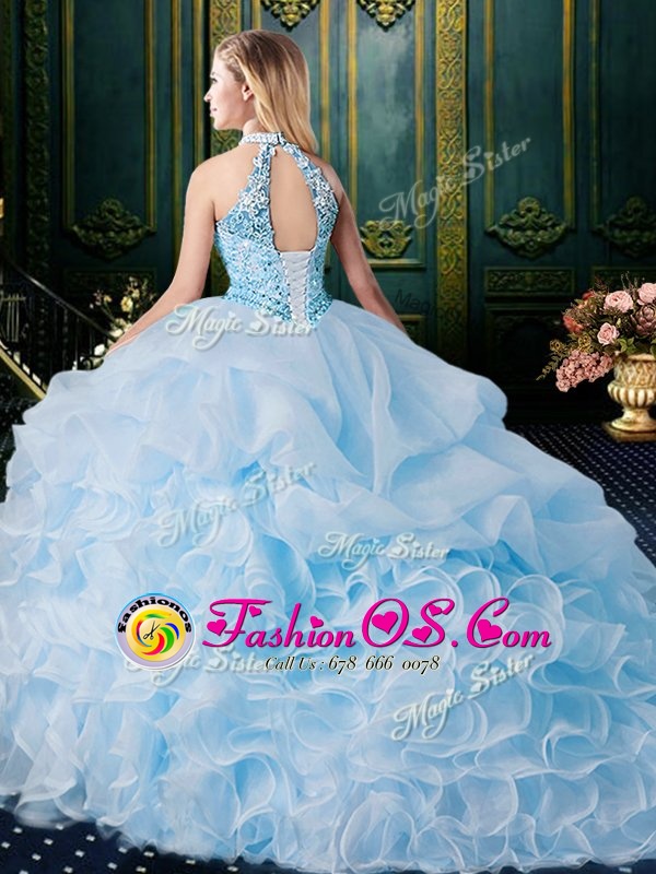 Apple Green Halter Top Clasp Handle Beading and Lace and Ruffles 15 Quinceanera Dress Brush Train Sleeveless