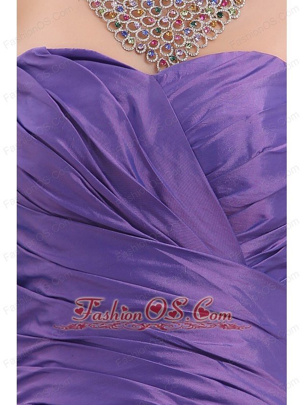 The purple prom dress is sure for you to own if you are searching for something purple. A fitted, strapless bodice made of ruched details accenting the sweetheart neckline. The full skirt with net material on the outlayer creates a beautiful shape to complete the dress. The back is zipper up back.