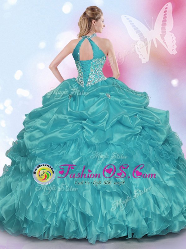 Halter Top Sleeveless Appliques and Ruffles and Pick Ups Lace Up Quinceanera Gown