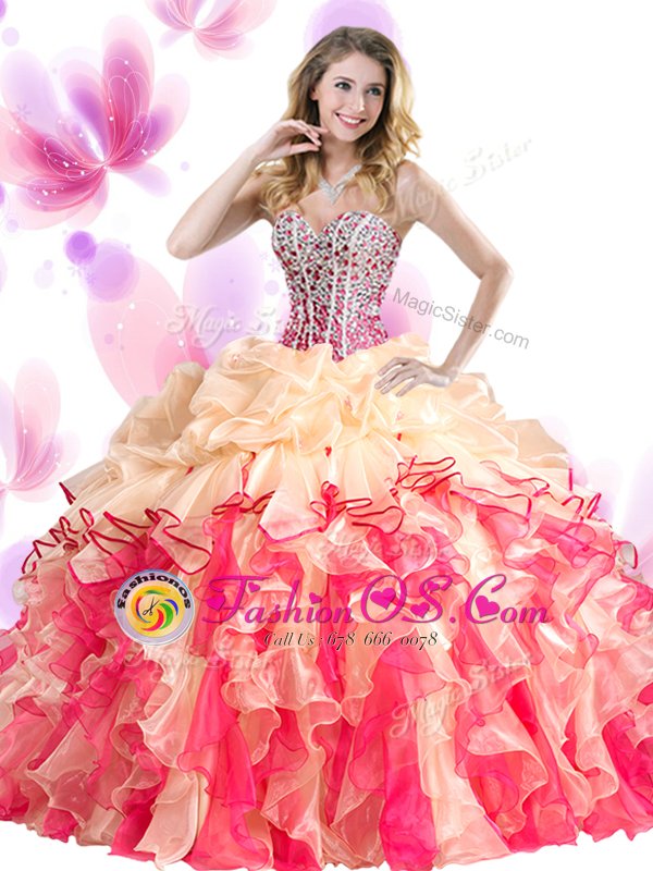 Unique Sleeveless Organza Floor Length Lace Up Quinceanera Dress in Apple Green for with Beading and Ruffles and Pick Ups