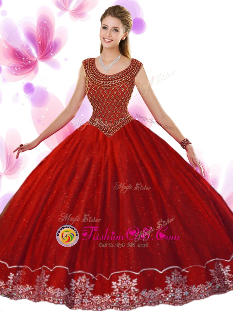 Scoop Wine Red Ball Gowns Beading and Appliques 15 Quinceanera Dress Zipper Tulle Sleeveless Floor Length