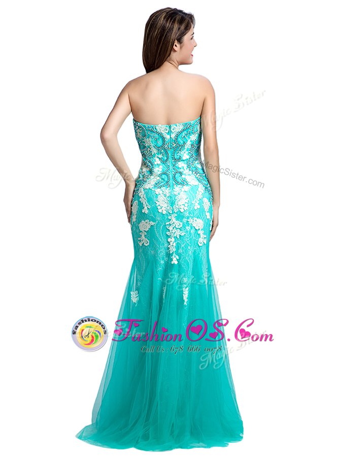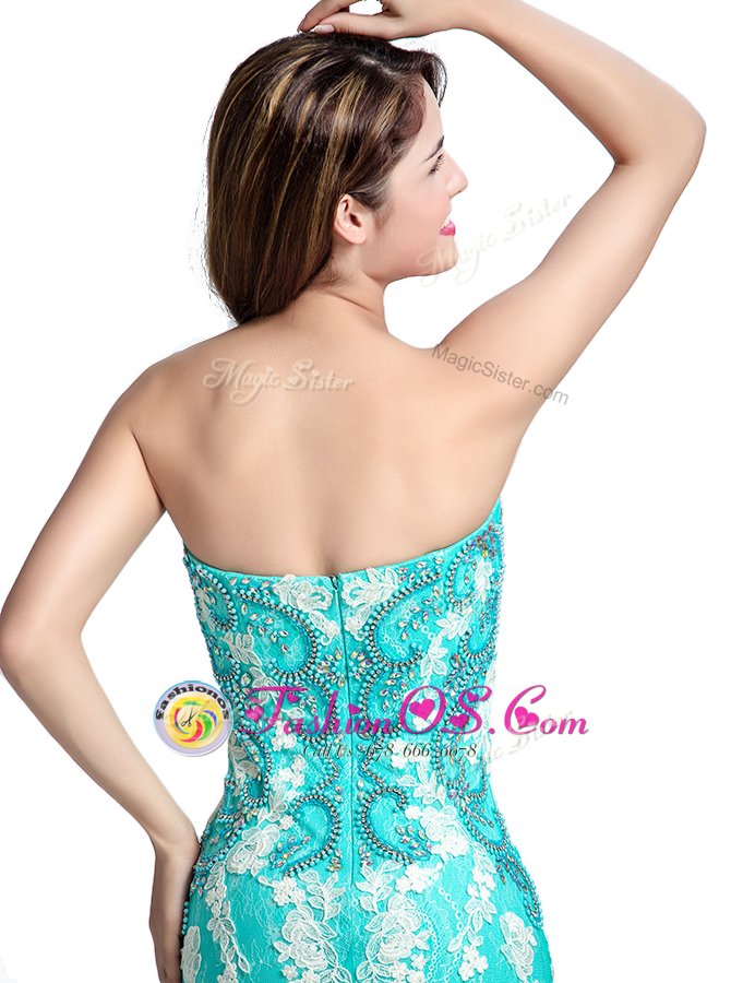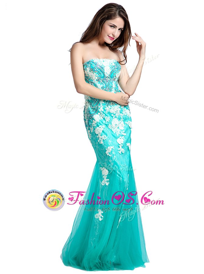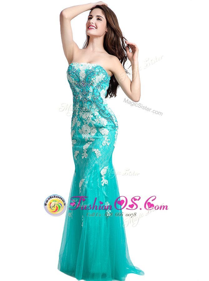 Mermaid Sleeveless Floor Length Beading and Appliques Zipper Prom Evening Gown with Turquoise