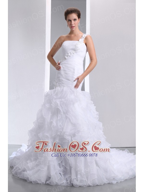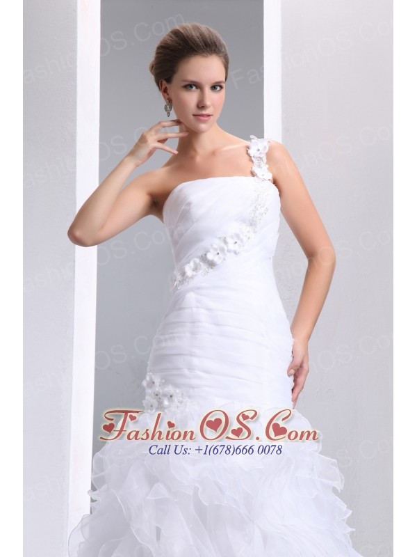 Romantic Mermaid One Shoulder Hand Made Flowers and Ruffles Wedding Dress Court Train Organza