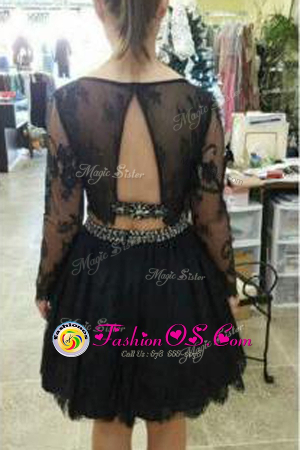 Scoop Long Sleeves Knee Length Lace Backless Homecoming Dress with Black