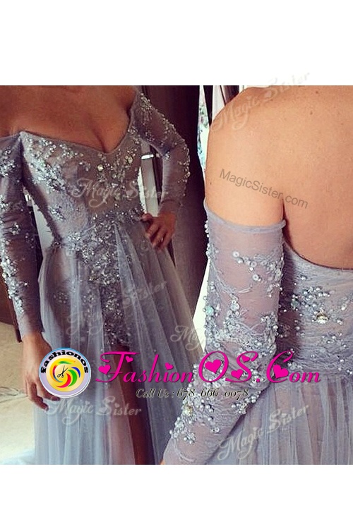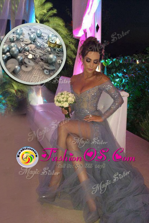 Hot Selling Off the Shoulder Grey Long Sleeves Organza Sweep Train Zipper Prom Dress for Prom and Party