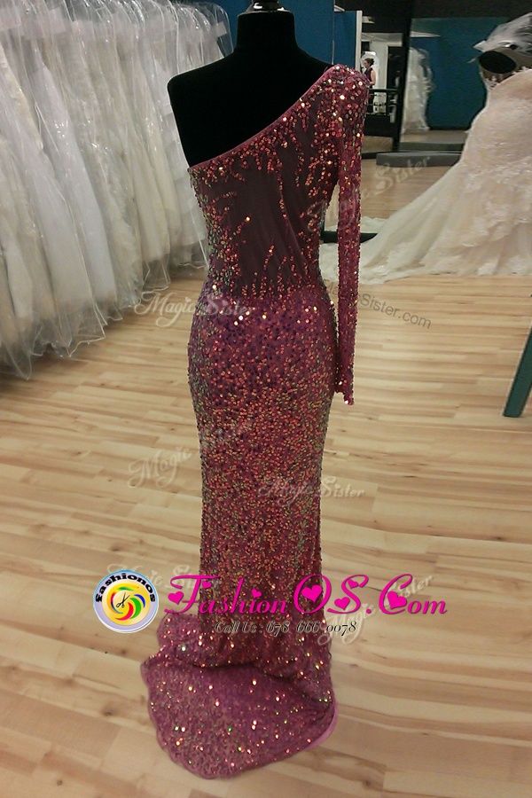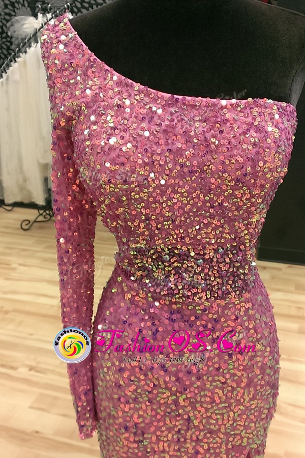 Mermaid One Shoulder Lilac Prom Gown Sequined Sweep Train Long Sleeves Sequins