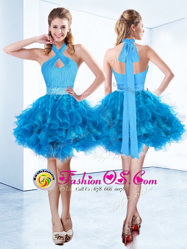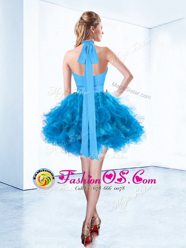Halter Top Sleeveless Prom Dress Mini Length Ruching and Belt Baby Blue Organza