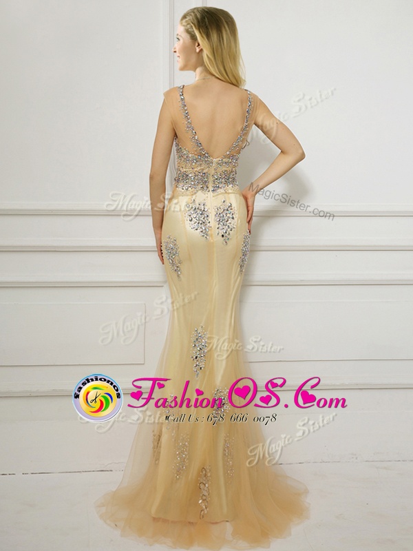 Mermaid Scoop Cap Sleeves Brush Train Backless Prom Dress Gold Tulle