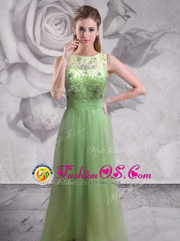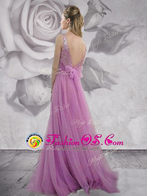 Lilac Empire Tulle Bateau Sleeveless Beading With Train Backless Dress for Prom Brush Train