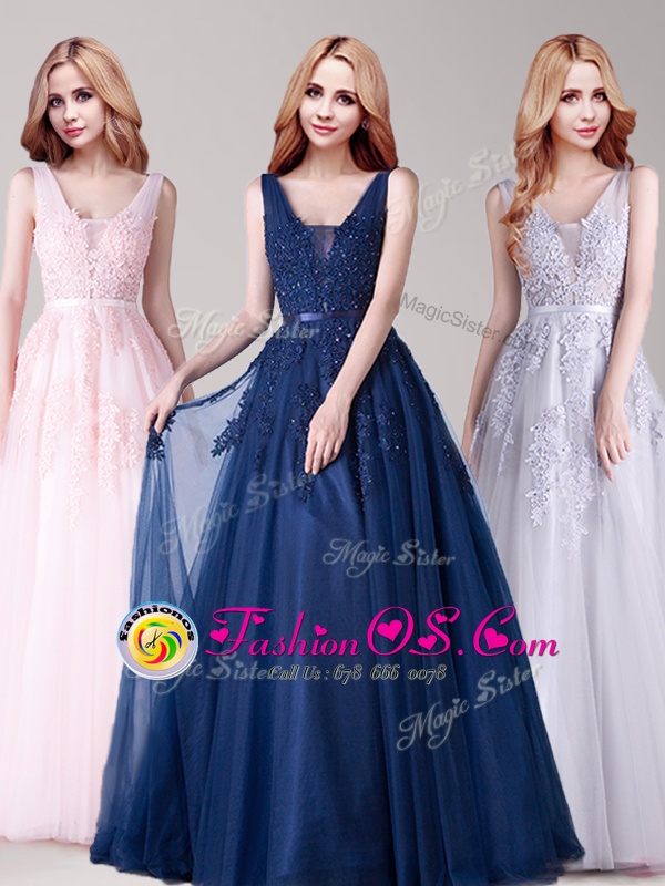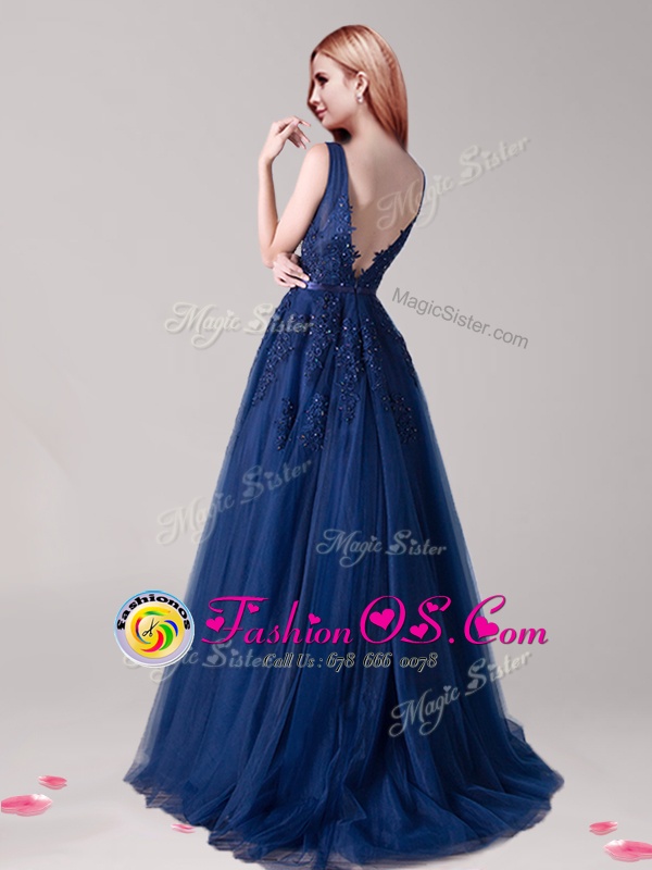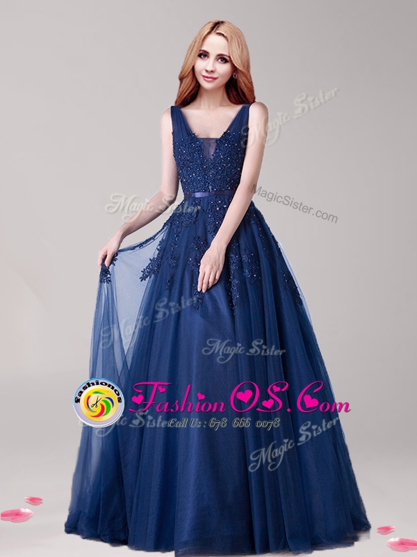 Appliques and Belt Prom Party Dress Navy Blue Backless Sleeveless Floor Length