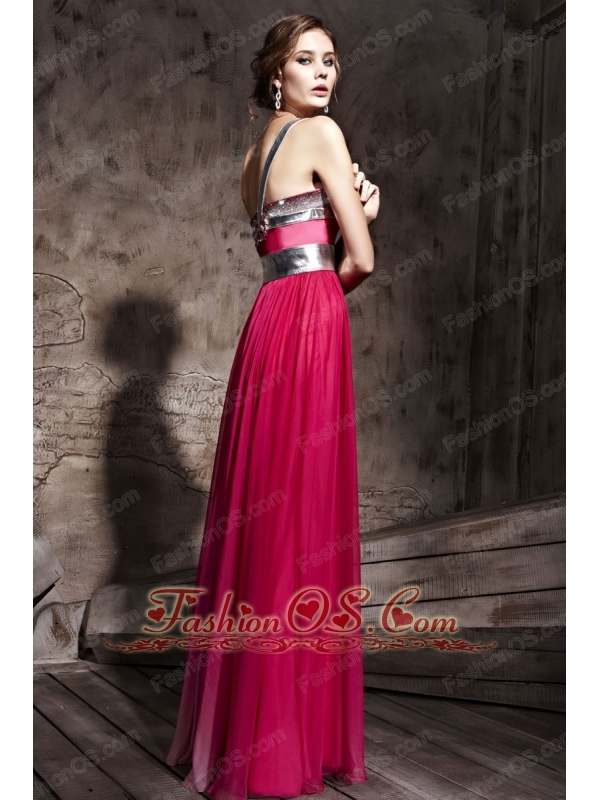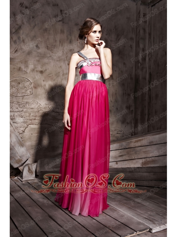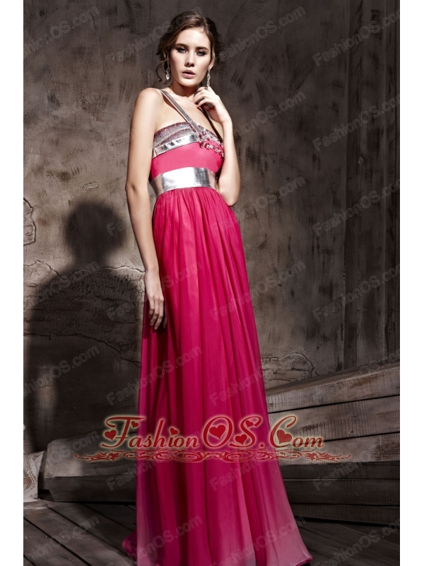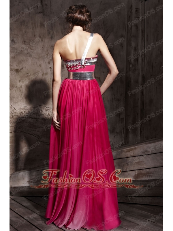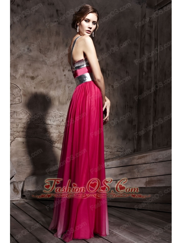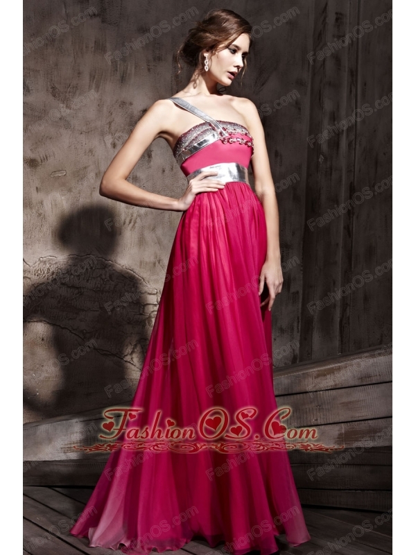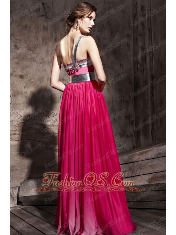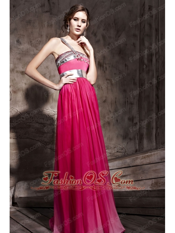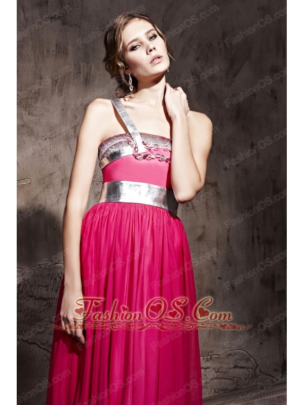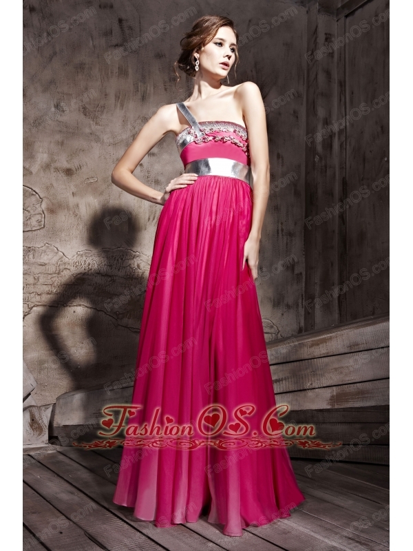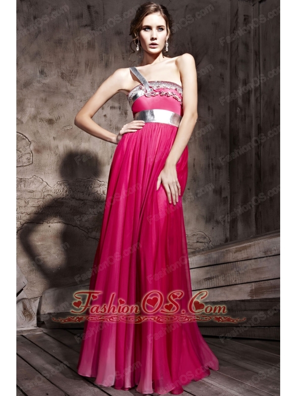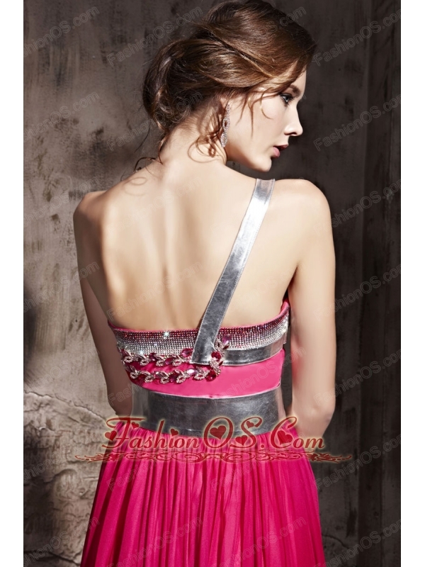 Hot Pink Empire One Shoulder Floor-length Chiffon Beading Prom / Party Dress