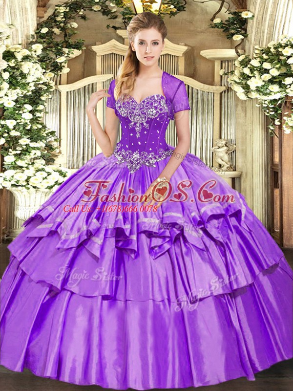 Fabulous Sleeveless Organza and Taffeta Floor Length Lace Up Ball Gown Prom Dress in Lavender with Beading and Ruffled Layers