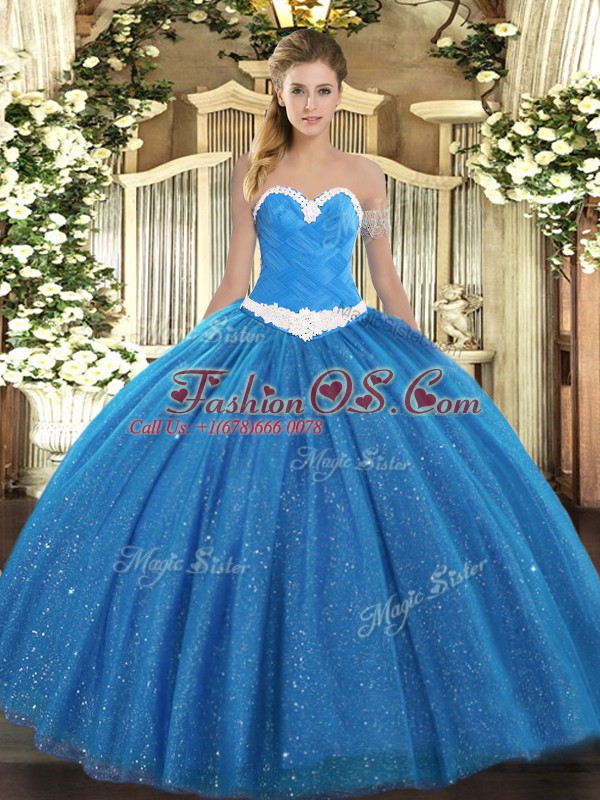 Custom Fit Blue Ball Gown Prom Dress Military Ball and Sweet 16 and Quinceanera with Appliques Sweetheart Sleeveless Lace Up