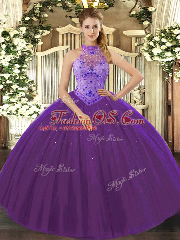 Beading and Appliques and Embroidery Vestidos de Quinceanera Purple Lace Up Sleeveless Floor Length