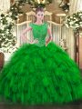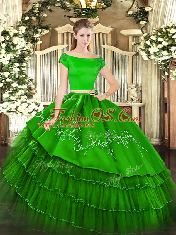 Captivating Short Sleeves Organza and Taffeta Floor Length Zipper 15th Birthday Dress in Green with Embroidery and Ruffled Layers