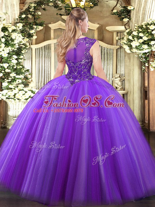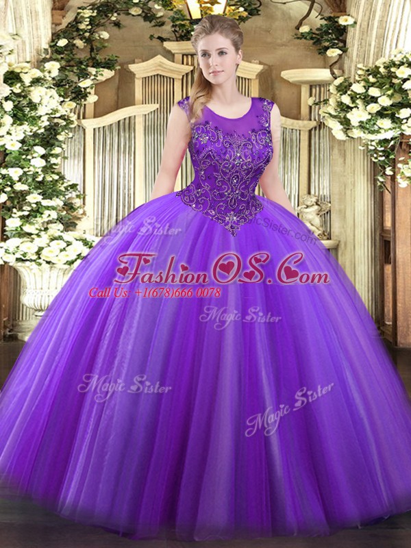 Pretty Eggplant Purple Ball Gowns Tulle Scoop Sleeveless Beading Floor Length Zipper Quince Ball Gowns