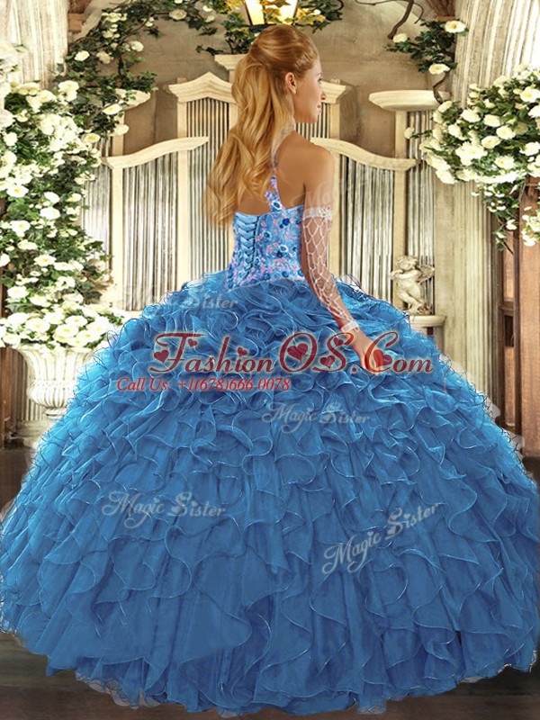 Colorful Blue Sleeveless Floor Length Beading and Embroidery and Ruffles Lace Up Quinceanera Gown