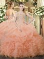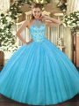 Deluxe Scoop Sleeveless Quinceanera Gowns Floor Length Beading and Appliques Fuchsia Tulle