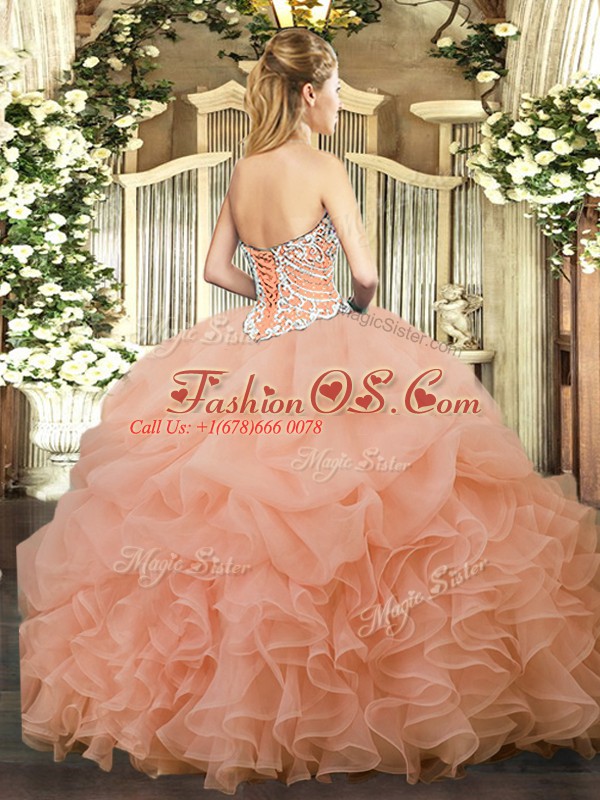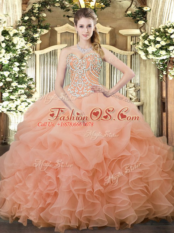 Pretty Peach Sleeveless Floor Length Beading and Ruffles and Pick Ups Lace Up Quinceanera Gowns