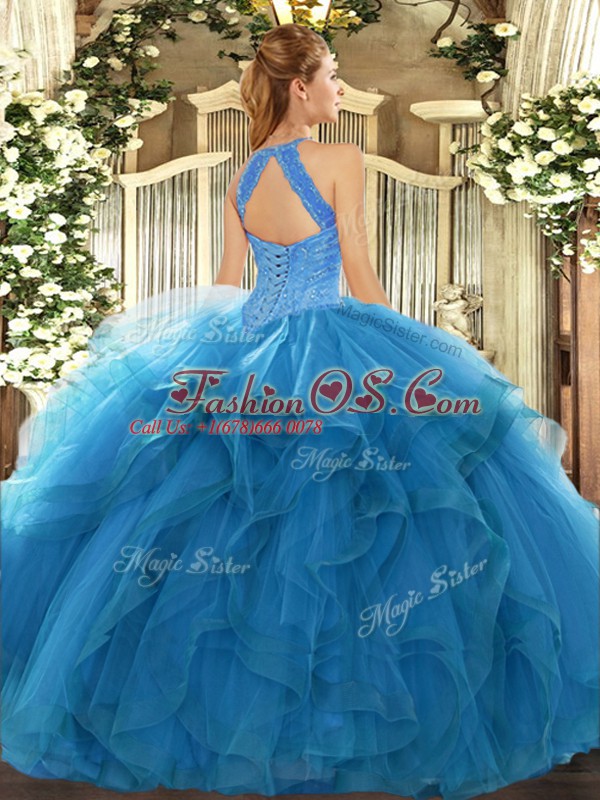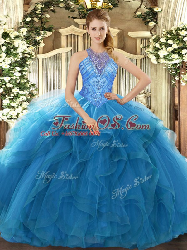 Teal High-neck Lace Up Beading and Ruffles Vestidos de Quinceanera Sleeveless
