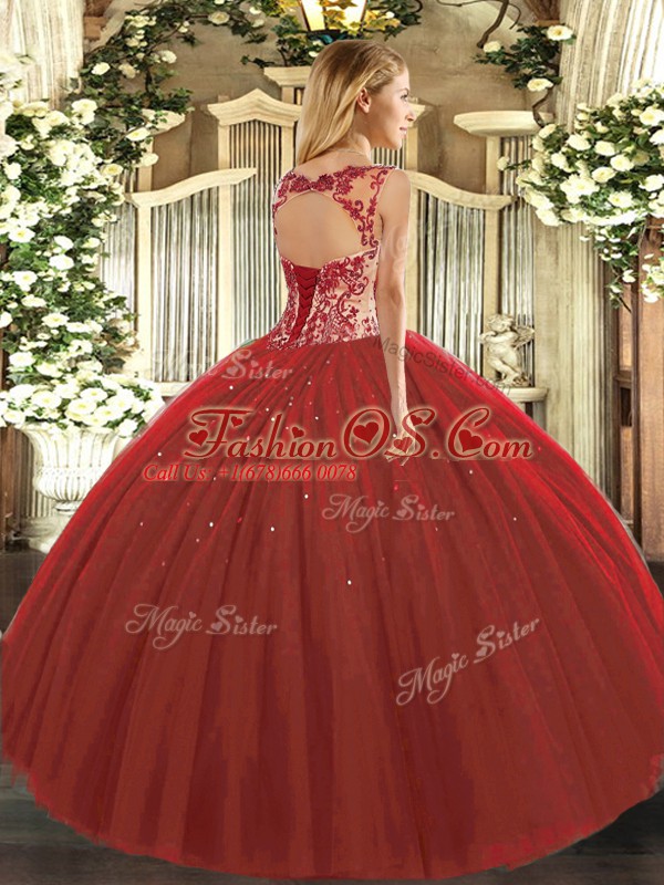 Dramatic Tulle Scoop Cap Sleeves Lace Up Beading and Appliques Quinceanera Gowns in Fuchsia