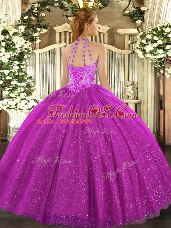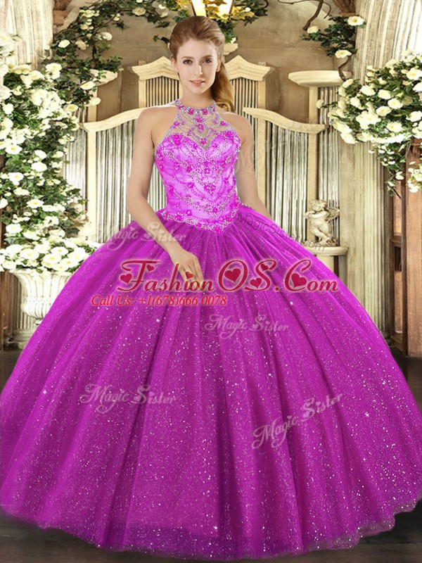 Fuchsia Lace Up Sweet 16 Quinceanera Dress Beading and Embroidery and Sequins Sleeveless Floor Length