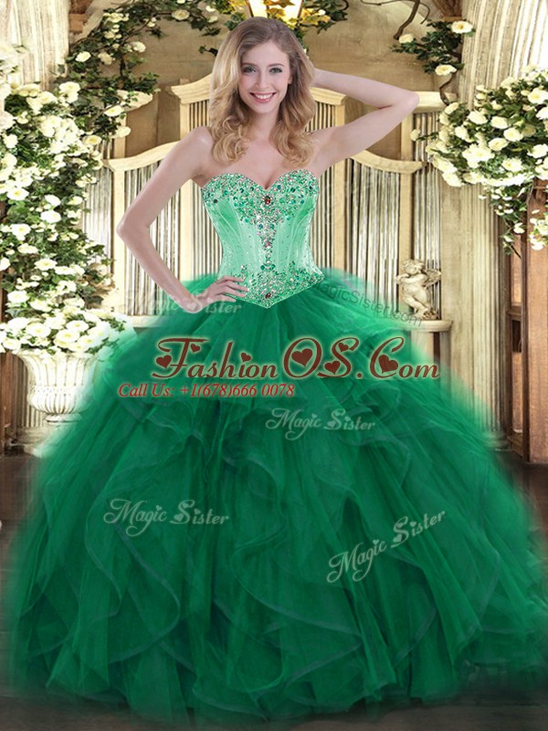 Nice Beading and Ruffles 15th Birthday Dress Dark Green Lace Up Sleeveless Floor Length