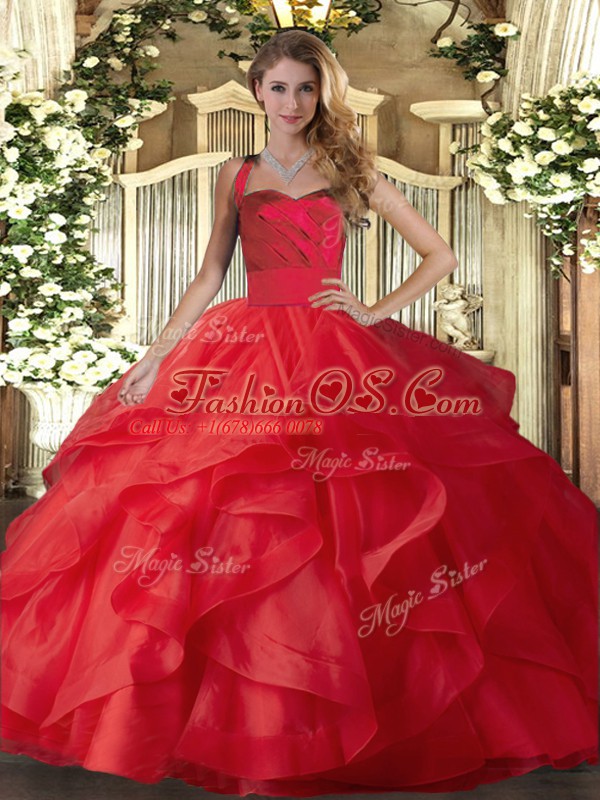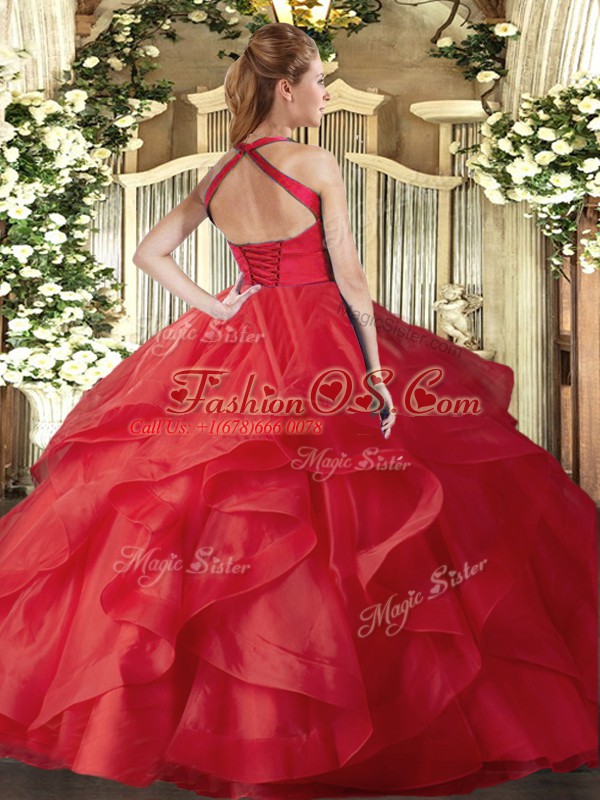 Red Lace Up Halter Top Ruffles Ball Gown Prom Dress Tulle Sleeveless