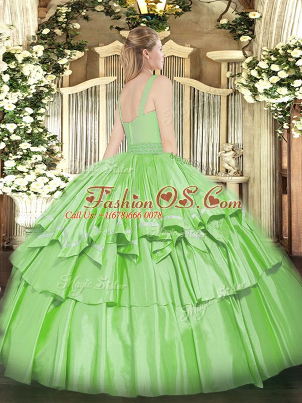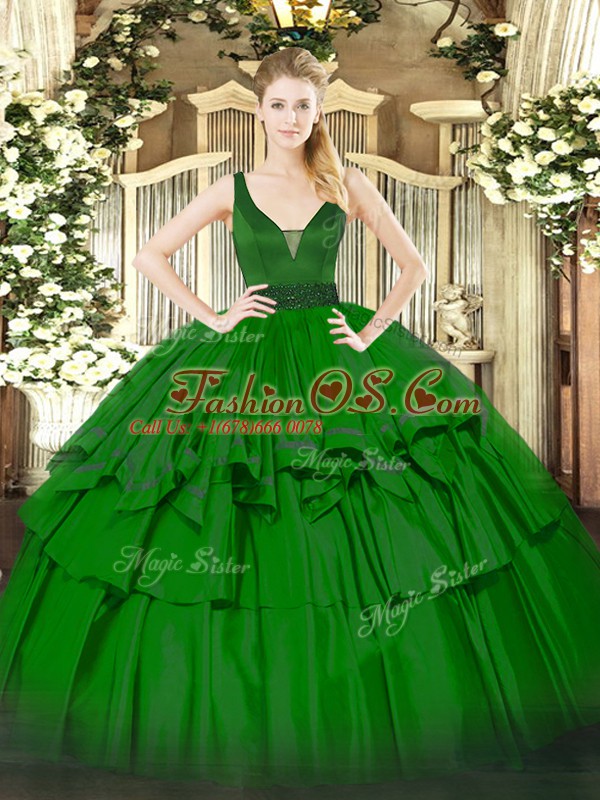 Customized Green Organza Zipper Quinceanera Gown Sleeveless Floor Length Beading and Ruffled Layers