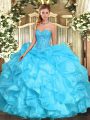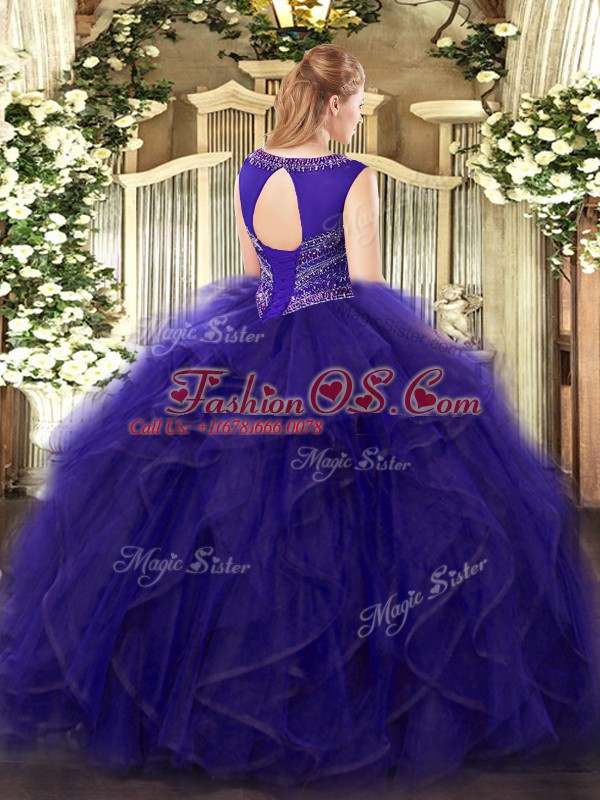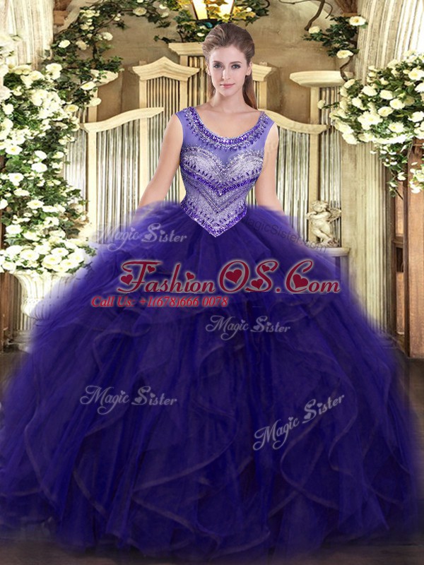 Smart Purple Ball Gowns Scoop Sleeveless Organza and Tulle Floor Length Lace Up Beading and Ruffles Sweet 16 Dress