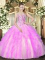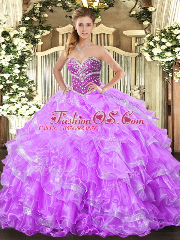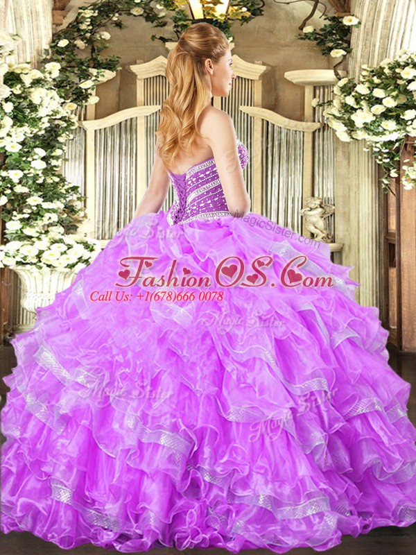 Floor Length Lace Up Ball Gown Prom Dress Lilac for Military Ball and Sweet 16 and Quinceanera with Beading and Ruffled Layers