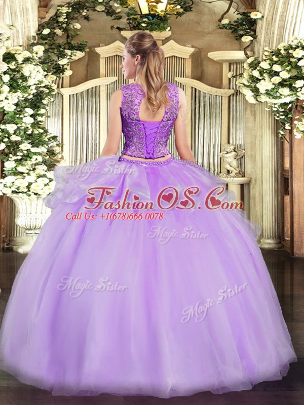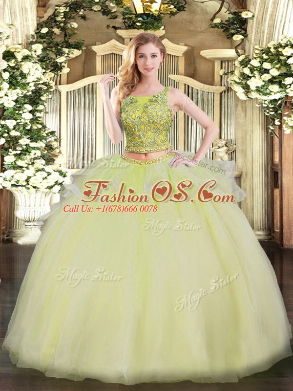 Custom Designed Yellow Two Pieces Organza Scoop Sleeveless Beading Floor Length Lace Up Quinceanera Gowns