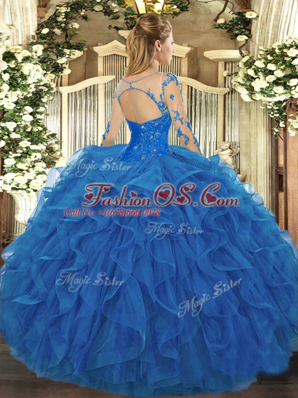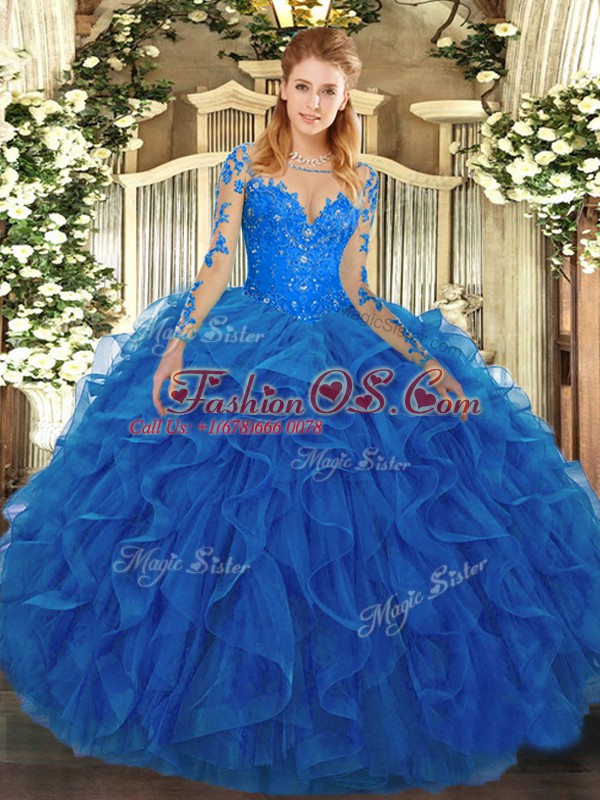 Blue Lace Up Sweet 16 Dress Lace and Ruffles Long Sleeves Floor Length