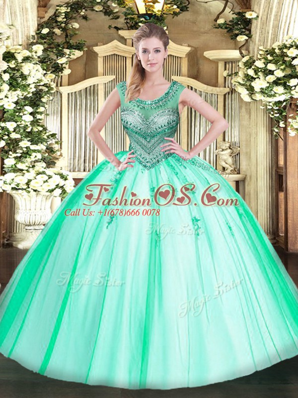 Fantastic Sleeveless Tulle Floor Length Lace Up Quinceanera Dresses in Apple Green with Beading